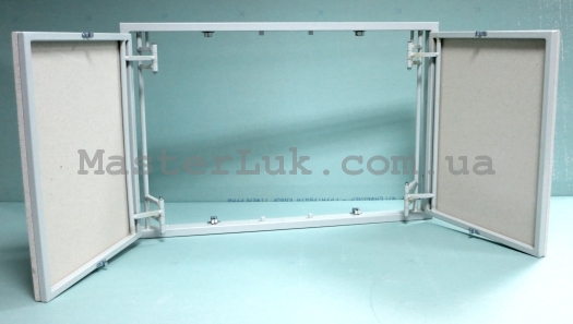 Дводверні, або як їх ще називають двостулкові, люки необхідно використовувати в разі, якщо ширина ревізійного отвору складає більше 700 мм. Використання дводверного люка забезпечить жорсткість конструкції і виключає можливість провисання дверцята при обробці її плитковими матеріалами. Такі люки влаштовуються для обслуговування великогабаритної техніки - такий як кондиціонери, бойлери, гребінки опалення, розподільники і т.п. У звичайних квартирах, "двухстворкі" встановлюють в перегородку за унітазом і вона, як правило за шириною не більше 120 см. У цьому ревізійному отворі зазвичай розташовані лічильники, фільтри, колектора холодної і гарячої води, а так само кілька полиць під інструменти або побутову хімію . Встановлювати такий люк можна від стінки до стінки і обидві двері будуть спокійно відкриватися. Існує кілька різновидів потайних ревізійних дводверних люків під плитку: За методом відкривання двохдверні люки діляться на три групи: